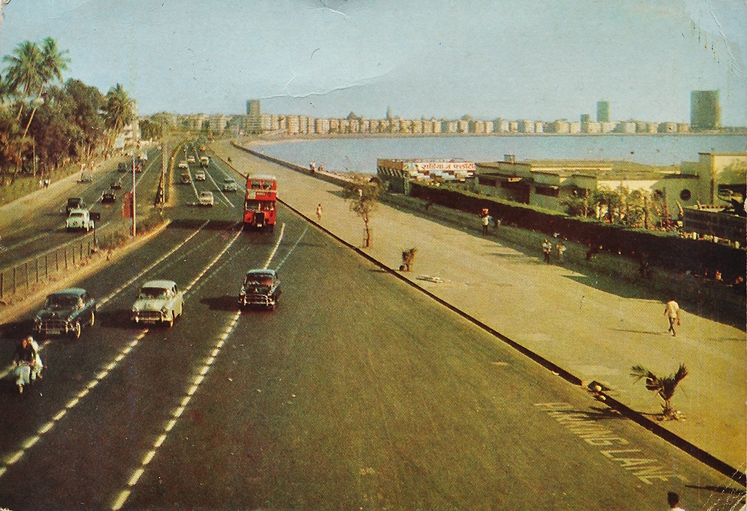 On the left side is evidently the Back Bay waters that is visible in the postcards (on the right in some of the views). Noteworthy are the Art Deco residential buildings that sprouted in the 1930s-40s, made chiefly for the Parsi residents. Looking towards the south in two of the postcards are the high-rise buildings of Air India and the Trident hotel. Both are situated on Nariman Point, the famous business center of Mumbai. Chowpatty Beach and the lush Malabar Hill are visible in a few of the pictures.
