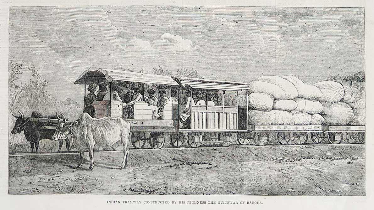 This is a page from the Illustrated London News of May 23, 1863, showing the First Narrow Gauge Railway in India. The collection also includes a commemorative First Day Cover from 1987 with a picture of this bullock-driven railway. Commissioned by Gaekwar, the Maharaja of Baroda. The Gaekwars were the dynastic rulers of Baroda; they are better known as Gaekwads.